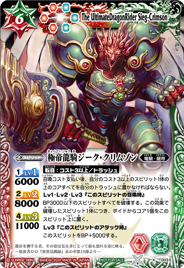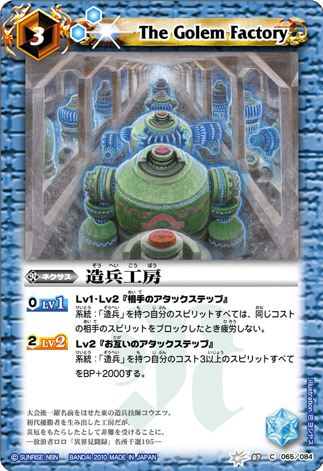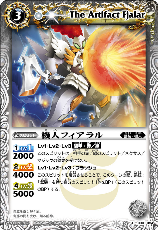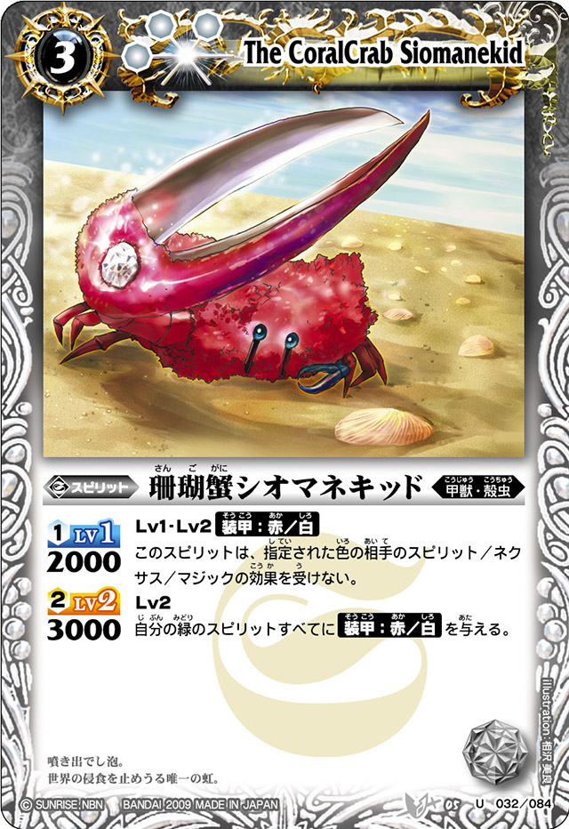 A curious addition is this Cost 3 White Spirit who seems a little bit lost to be honest. This is the CoralCrab Siomanekid, from the Armored Beast and Shell Insect families. However the reason it’s here is because the deck is intended to accumulate as much core as possible, meaning there’s plenty to spend on this card’s Lv2, which supports Green Spirits by sharing it’s Armor to Red and White cards with them. It’s quite similar to The IronKnight Yggdrassil in that way.