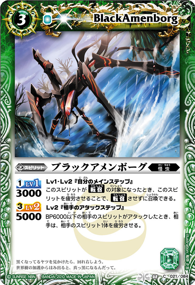 BlackAmenborg is part of a series of Cost 3s in BS08, all of which who are dark versions of existing spirits, who all have the effect of, when targeted as the Tribute for a Spirit, they can exhaust themselves to ignore the Tribute.