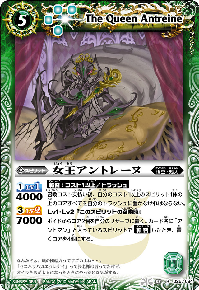 Notably there’s a large portion of cards all sharing the name “Antman”, that’s because also sharing the deck is The Queen Antreine. Another tribute spirit who summons herself by tributing a Cost 1 or greater Spirit, the core in this case is sent to the Trash rather than the Void.