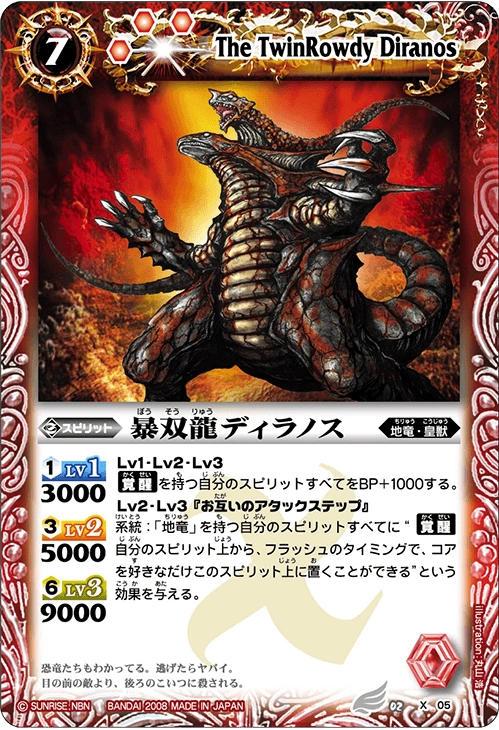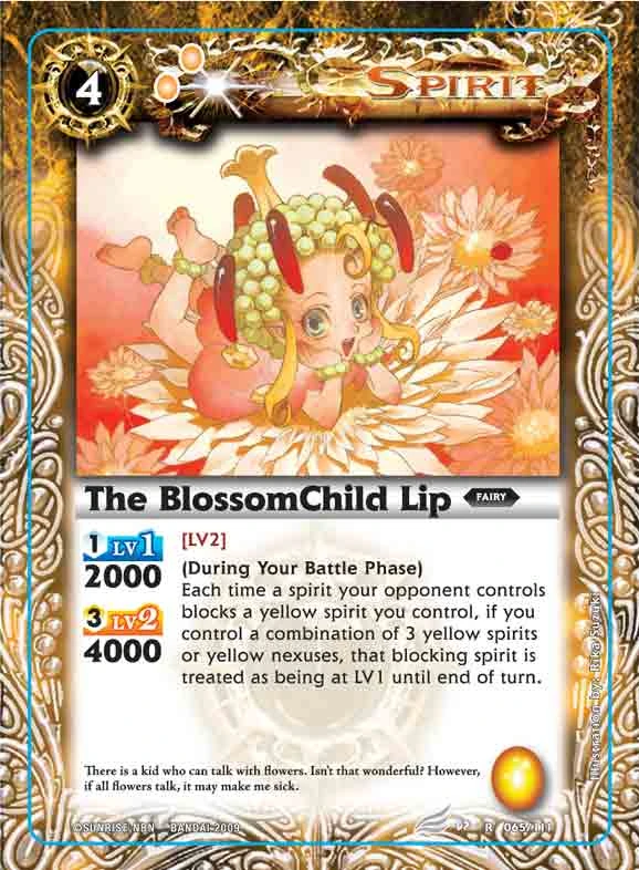 The fun part about the reveal effects in Battle Spirits is that it actually gives us insight into what else is in their deck without them playing them. Piyon and Arcanabeast-Ken is pretty run of the mill, and while we haven’t seen it played, we’ve seen The BlossomChild Lip among the cards Meganeko owns which also fits in with the 3 Yellow Spirit/Nexus strategy Smile is now bumping.